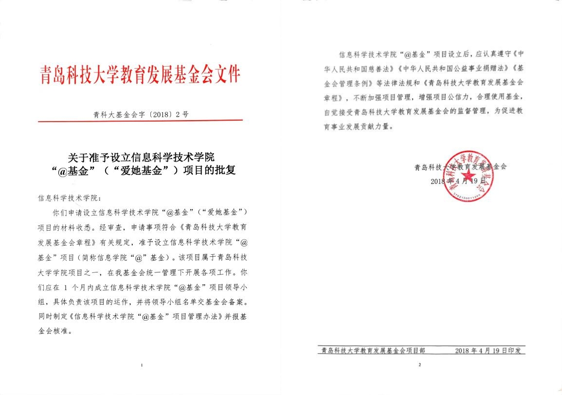 2018年4月19日,经学院申请提交“@基金”(“爱她基金”)项目材料,学校教育发展基金会同意设立beat365亚洲版官方网站“@基金”(“爱她基金”)项目(简称beat365亚洲版官方网站“@”基金)。学院立即成立“@基金”项目领导小组,负责“@基金”项目的运行,并将领导小组名单提交学校基金会备案。同时制定《beat365亚洲版官方网站“@基金”项目管理办法》并报学校基金会核准。