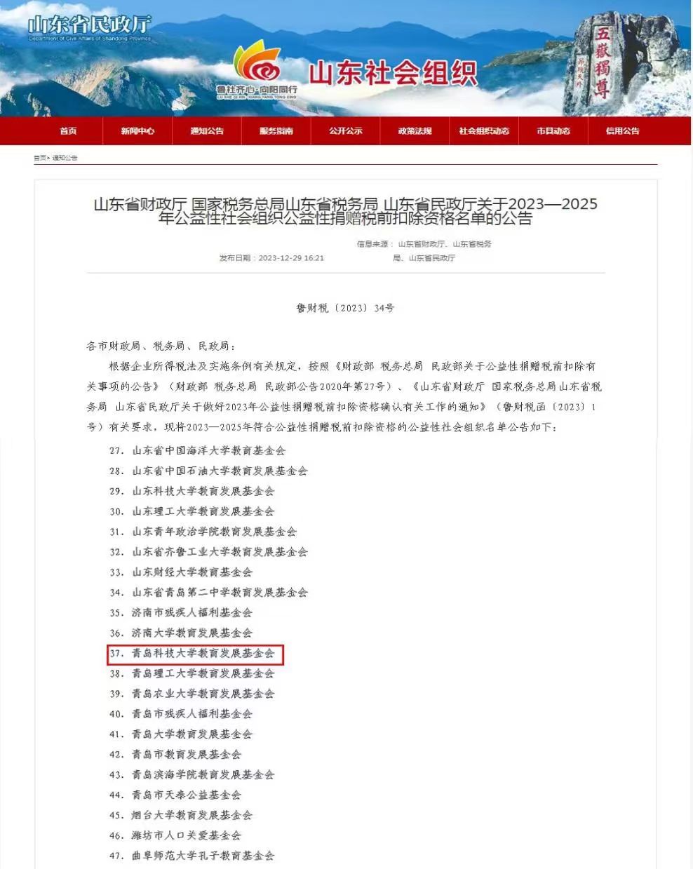 山东省财政厅、国家税务总局山东省税务局、山东省民政厅联合发布了2023—2025年公益性社会组织公益性捐赠税前扣除资格名单的公告,我校基金会名列其中。