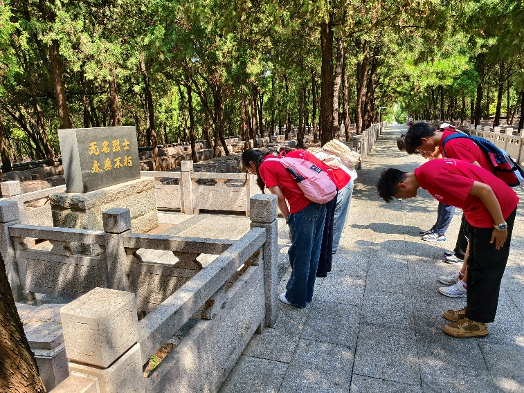 离开山东博物馆,团队前往济南战役纪念馆周边的无名烈士墓区。在“无名烈士 永垂不朽”纪念碑前,成员们整齐列队、庄重鞠躬。静默的墓碑,承载着无数先烈为济南解放与发展英勇献身的壮烈故事,虽姓名未著史册,但精神永驻心间。这一刻,缅怀是对历史的铭记,更是对红色精神传承的庄严承诺,激励着成员们将家国情怀厚植于心。