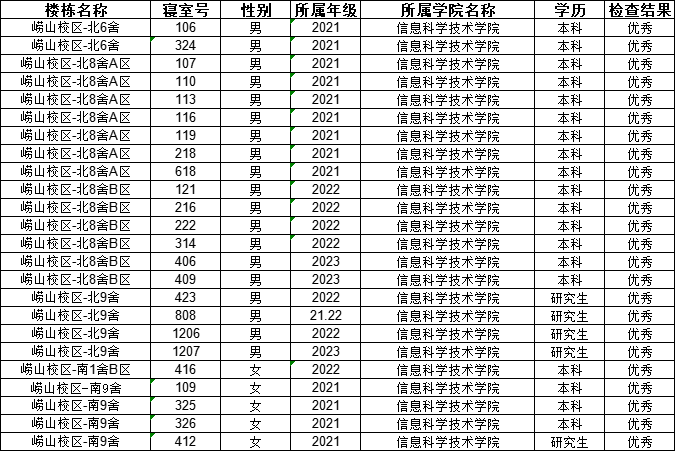 为进一步加强学生宿舍内务卫生和安全文明创建,强化学生宿舍安全意识,营造一个安全舒适、整洁优雅、文明和谐的宿舍环境。5月15日,学生工作处、后勤管理处及各学院开展了学生宿舍卫生安全秩序大检查。本次共抽查beat365亚洲版官方网站宿舍148间,24间宿舍获评“优秀宿舍”,优秀率16.22%,合格宿舍124间,合格率83.78%,无不合格宿舍。优秀宿舍详见名单。